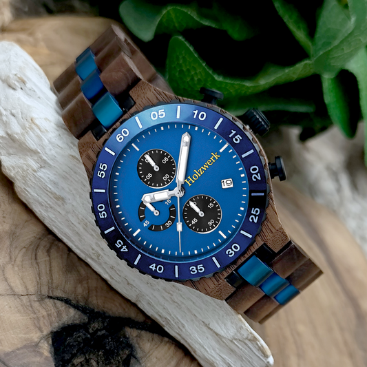 • Holzwerk LOHMAR Chronographen-Uhr aus Walnuss-Holz mit Chronographen, Datumsanzeige und blau-schwarzem Ziffernblatt, frontal
