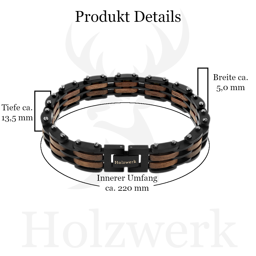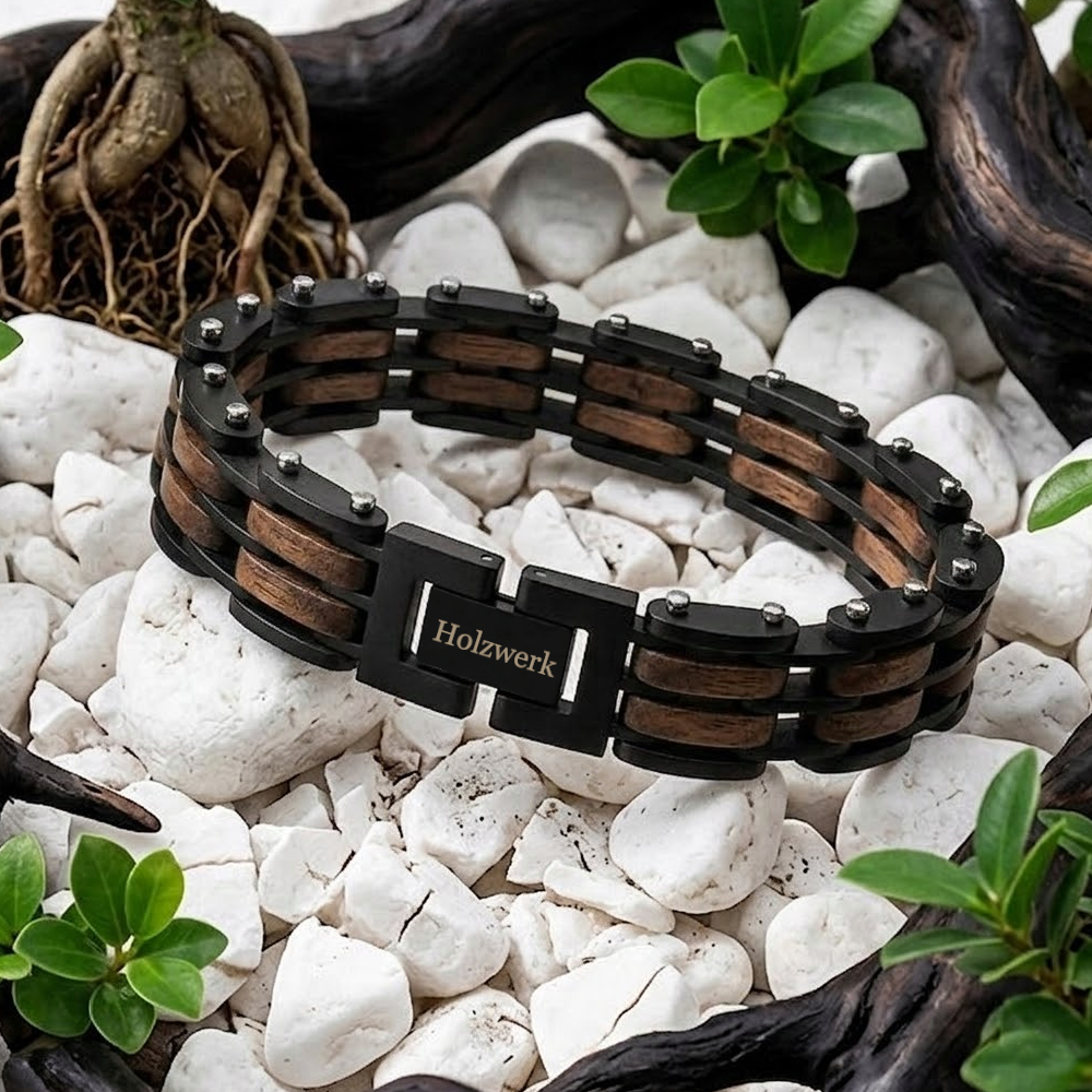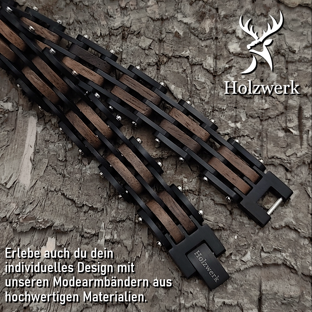 Natürliches Holz und Edelstahl vereint durch besondere, aus dem Uhrenbereich inspirierte, Gliederkonstruktion. Genieße die einmalige Optik und Haptik von Holz in Kombination mit feinstem Edelstahl und lass dich vom Tragegefühl begeistern. Durch unsere besonderen Konstruktionen aus hochwertigen Materialien trägst du mit deinem Holzwerk Armband ein echtes Unikat am Armgelenk.