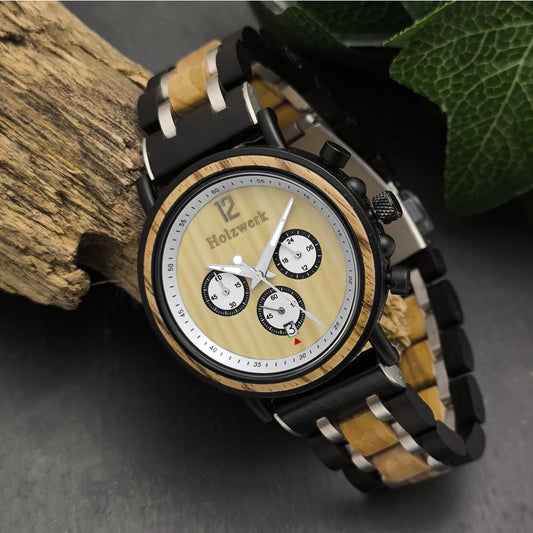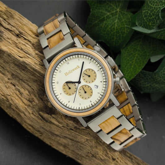 Holzwerk men's mechanical automatic wooden watch beige silver grey