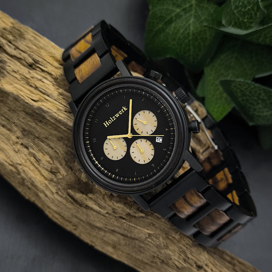 Holzwerk men's watch wooden chronograph with date in black and blue