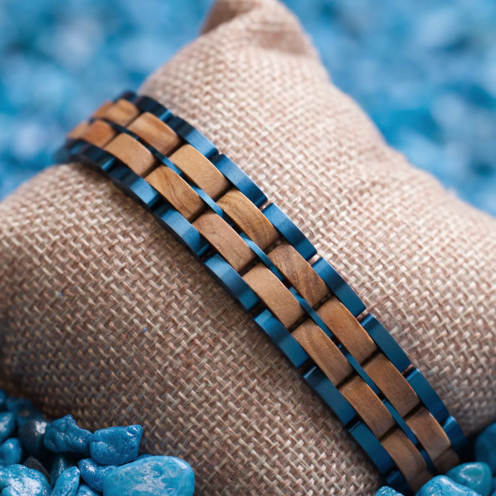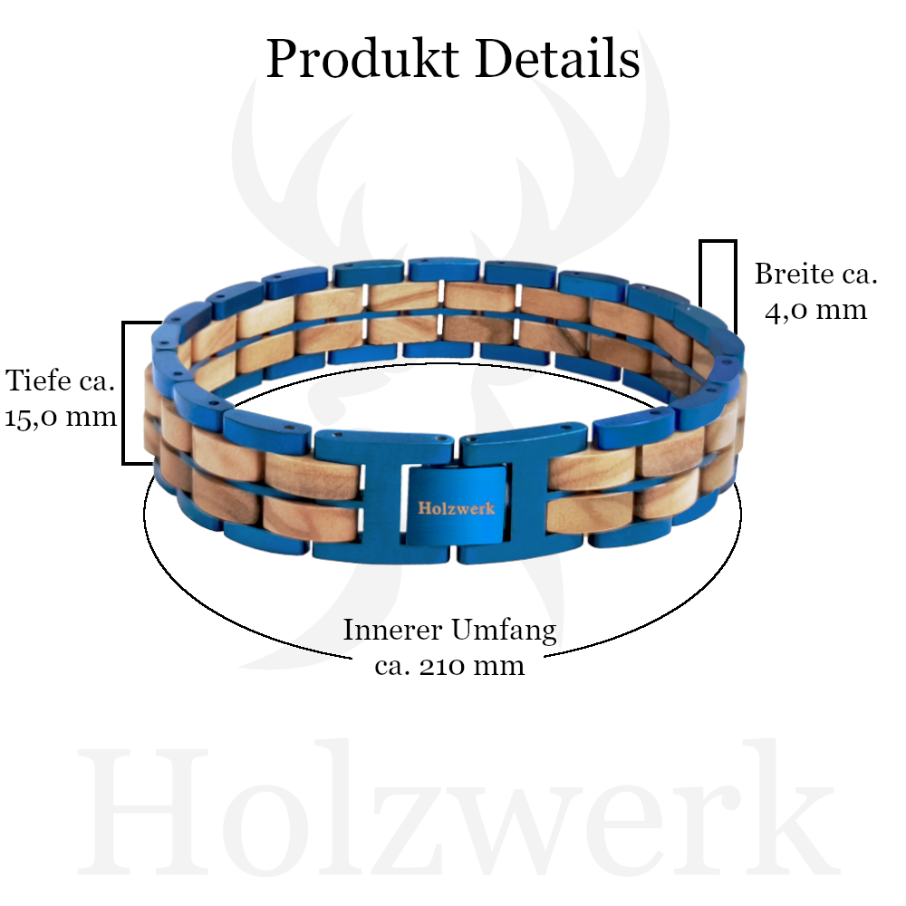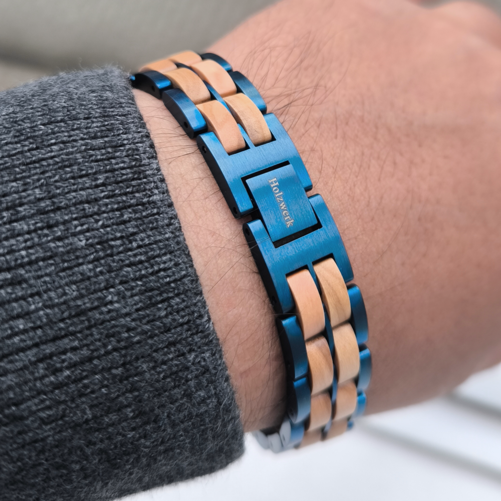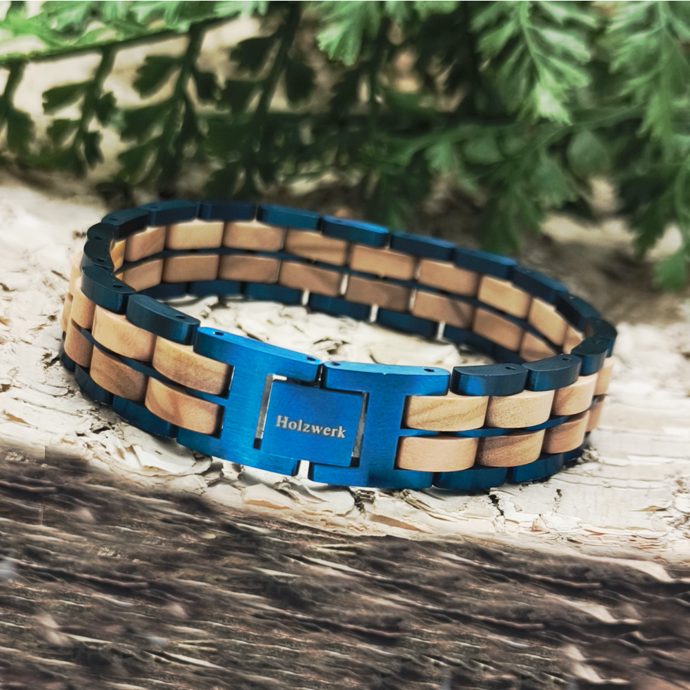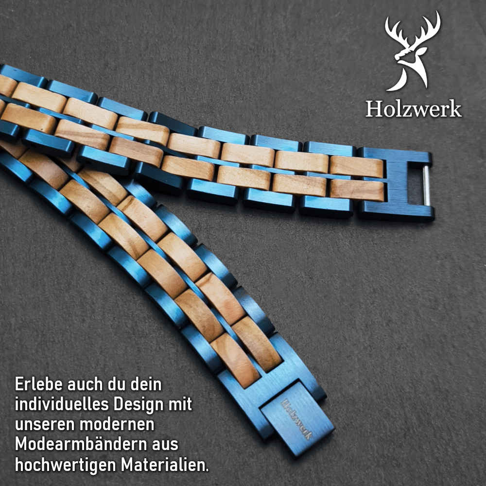 Natürliches Holz und Edelstahl vereint durch besondere, aus dem Uhrenbereich inspirierte, Gliederkonstruktion. Genieße die einmalige Optik und Haptik von Holz in Kombination mit feinstem Edelstahl und lass dich vom Tragegefühl begeistern. Durch unsere besonderen Konstruktionen aus hochwertigen Materialien trägst du mit deinem Holzwerk Armband ein echtes Unikat am Armgelenk.